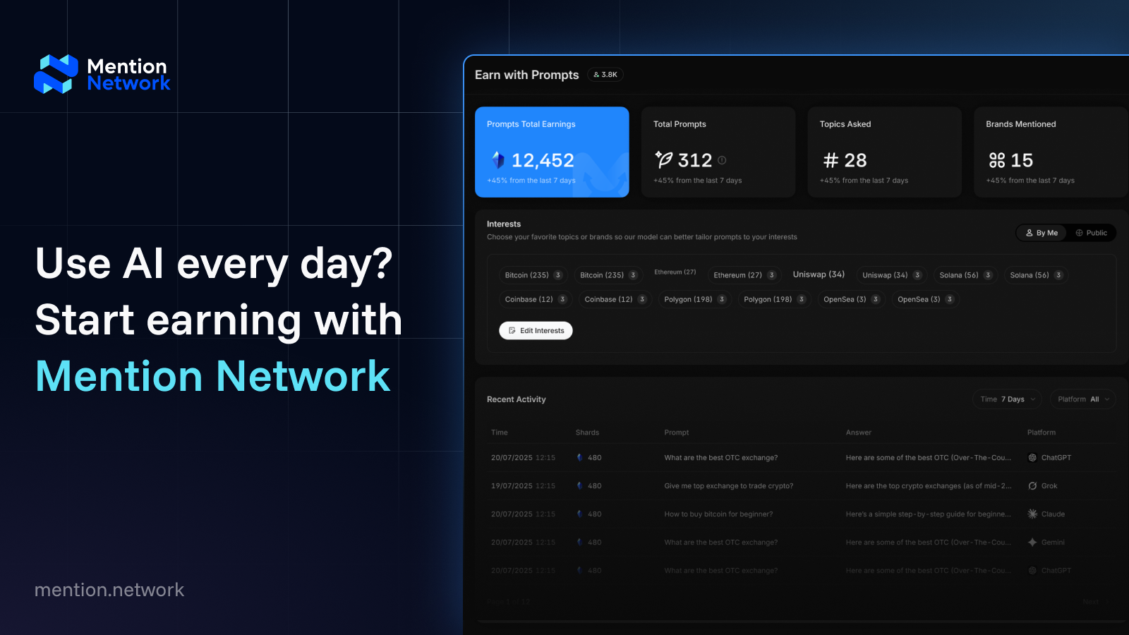 ChatGPT, Claude, Gemini, and Grok all learned from you. It's time you got paid! Mention Network is the first decentralized GEO platform designed to track and amplify AI Visibility for brands. Using a Browser Extension as a data-crawling approach, Mention Network collects real-time prompts from real users across major AI models, empowering brands with AI analytics while incentivizing contributors with Mention Shards.